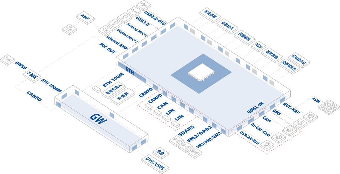 单一产品支持仪表、中控、副驾、后座娱乐、空调控制、HUD、环视等